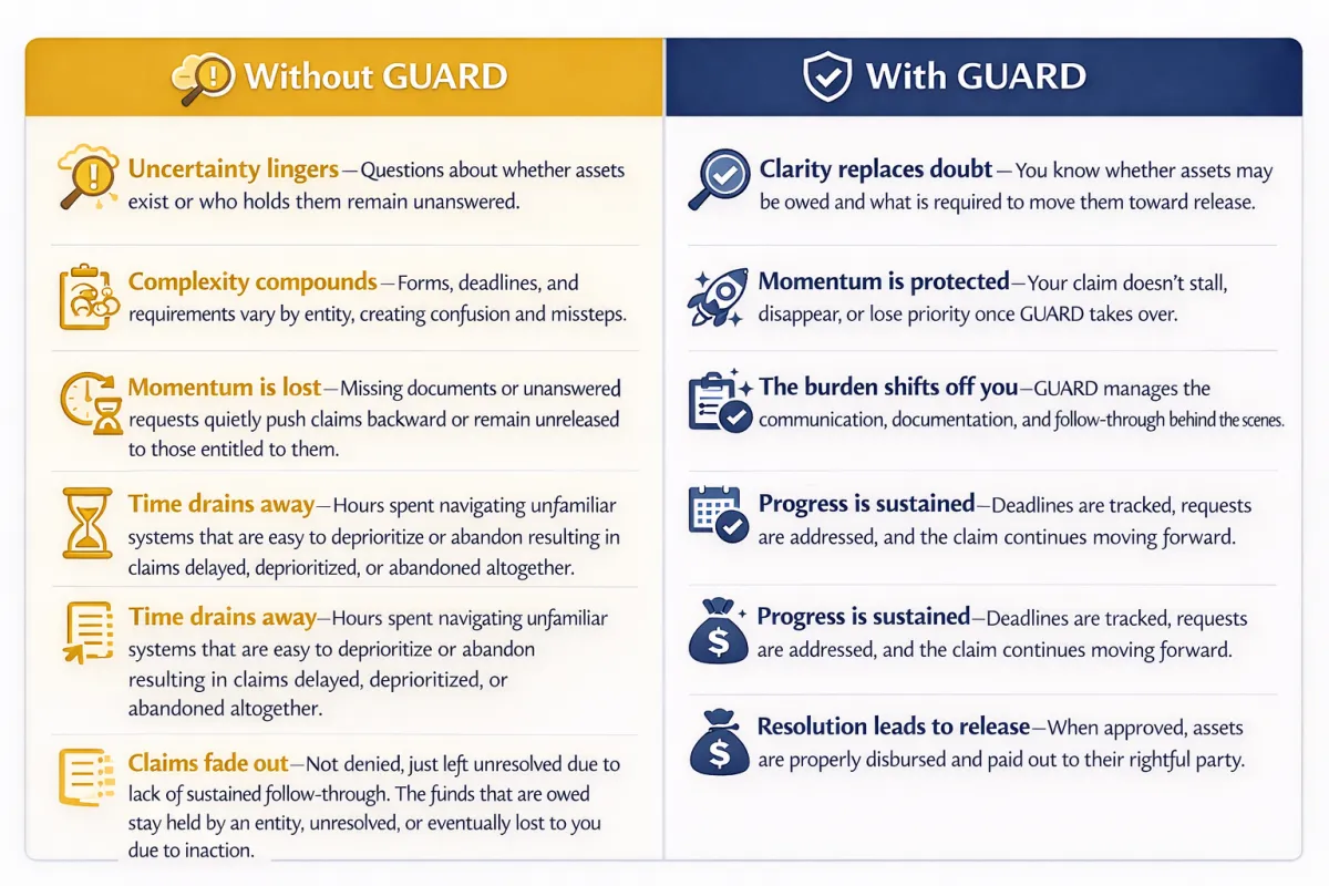 GUARD exists to prevent that loss. We take ownership of the process, manage the follow-through, and keep claims moving—so assets owed to you don’t remain out of reach.